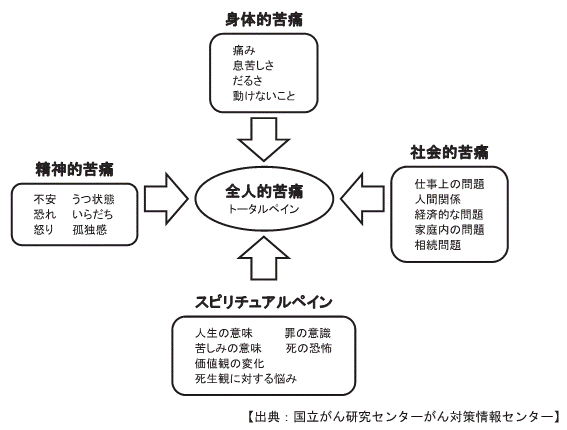がんと診断された時からの緩和ケアを推進し、がん患者とその家族が受ける身体的苦痛、精神的苦痛などを含めた全人的苦痛(トータルペイン)(図)に対応する必要があります。近年では、がん患者ががんと向き合いながら最後まで自分らしく生きるという「がんサバイバーシップ」の考え方も広がりつつあり、そのための支援も必要です。
