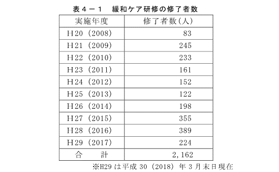 拠点病院等は、緩和ケアチームを整備するとともに、外来において専門的な緩和ケアを提供できる体制にあります。また、拠点病院や県では、国の指針に準拠した緩和ケア研修会を開催し、緩和ケアに携わる医師の増加と資質向上を図っており、緩和ケア研修を終了した医師数は平成29(2017)年度末で2,162人と、第2次計画の目標である1,800人を超えています。(表)
