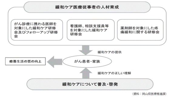 - 拠点病院等やがん治療を実施している医療機関は、岡山大学病院が作成した「痛み日記」等の活用により、がん患者が安心して緩和ケアを受けられる環境を整えます。